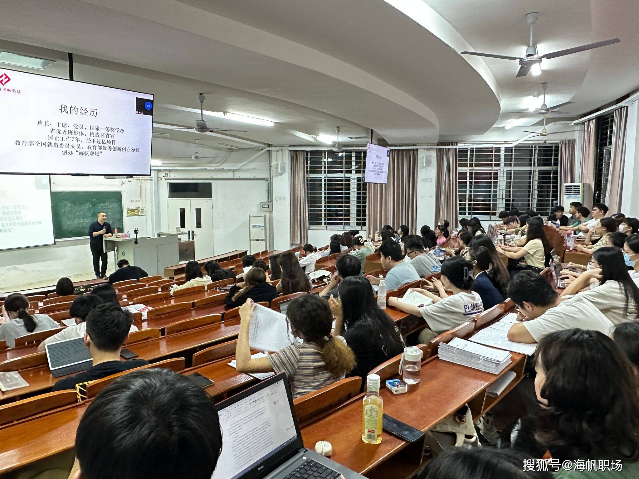 为进一步促进2023届毕业生高质量就业,帮助毕业生全面解读就业创业政策,5月15日晚,华侨大学旅游学院在敬萱堂阶梯教室举办毕业生就业创业交流会,本次交流会邀请到海帆职场创始人CEO、 教育部全国普通高校毕业生就指委委员、教育部首批创新创业导师、福建省就业创业导师团成员、华侨大学校外辅导员、旅游学院校友夏希东为毕业年级学生详细讲解当前就业形势,2023届全体毕业生线上线下参加会议。